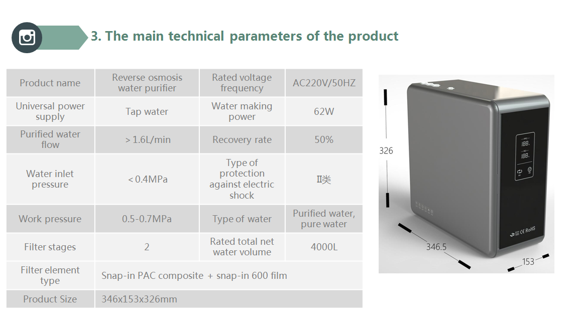 Energy saving: Through the combination of composite filter element technology and waste water needle, the waste water discharge during the operation of the product is reduced to save water. The waste water needle is also replaced when the RO membrane is replaced.